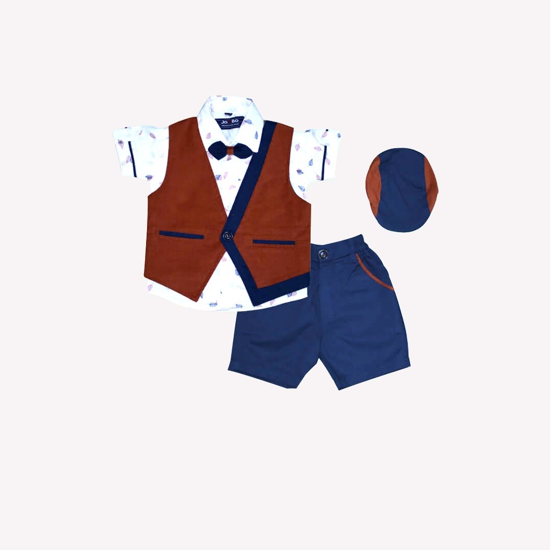 Dress your little gentleman in this charming Baby Boy 3-Piece Formal Outfit with Hat, perfect for special occasions and formal gatherings. This set includes a crisp white printed shirt, a stylish brown vest with navy blue accents, navy shorts, and a matching cap for a complete look. The bowtie adds a sophisticated touch, making your little one the star of the show. Crafted from comfortable and breathable fabric, this outfit ensures ease of movement and all-day comfort. Whether it’s a family gathering, photoshoot, or birthday celebration, this outfit is an excellent choice for a memorable look.