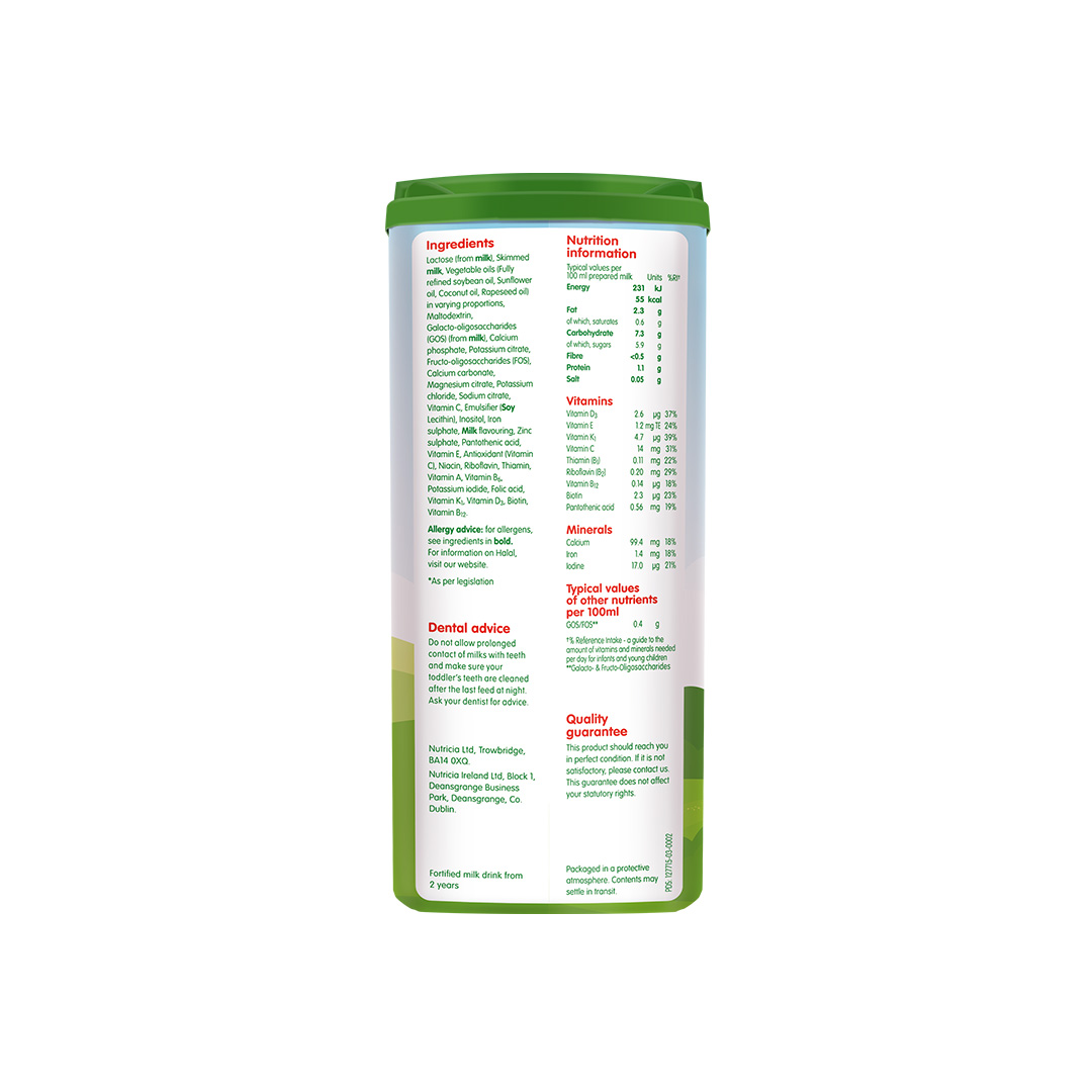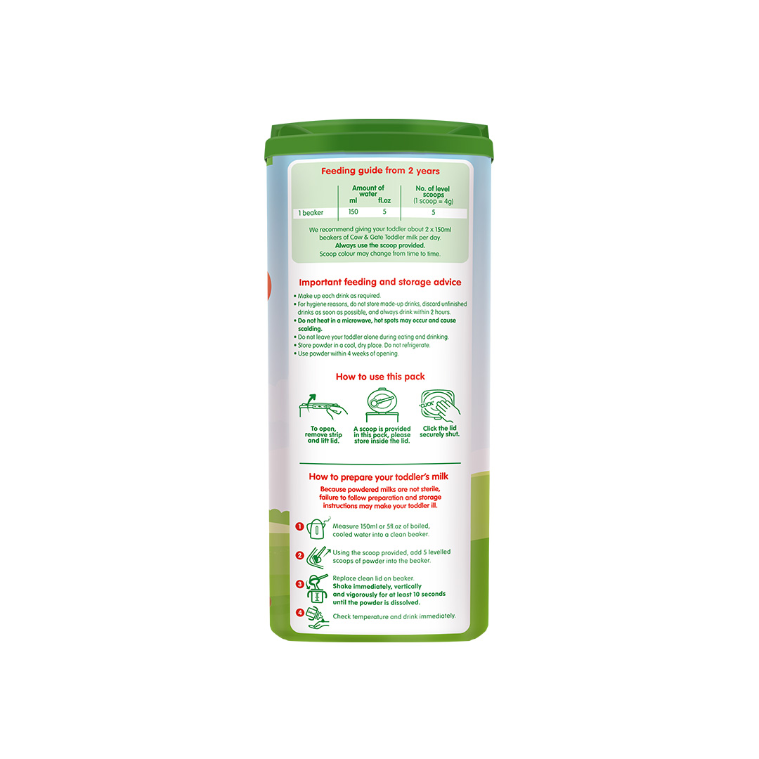 Cow & Gate 4 Growing Up Milk is carefully formulated with a slightly more nutritious semi-skimmed version for older toddlers aged 2 or above as they continue to grow and develop during this active stage. This Stage-4 formula is great for toddlers as they begin to grow more independently by getting proper nutritions. It provides DHA (Omega-3), an important ingredient for brain and vision development. It also contains a higher level of vital vitamins and minerals that support growing bones and energy needs during this critical stage. Cow & Gate has been a trusted name in baby care for centuries, where 97% parents agree their baby is settled when drinking Cow & Gate growing-up milk.