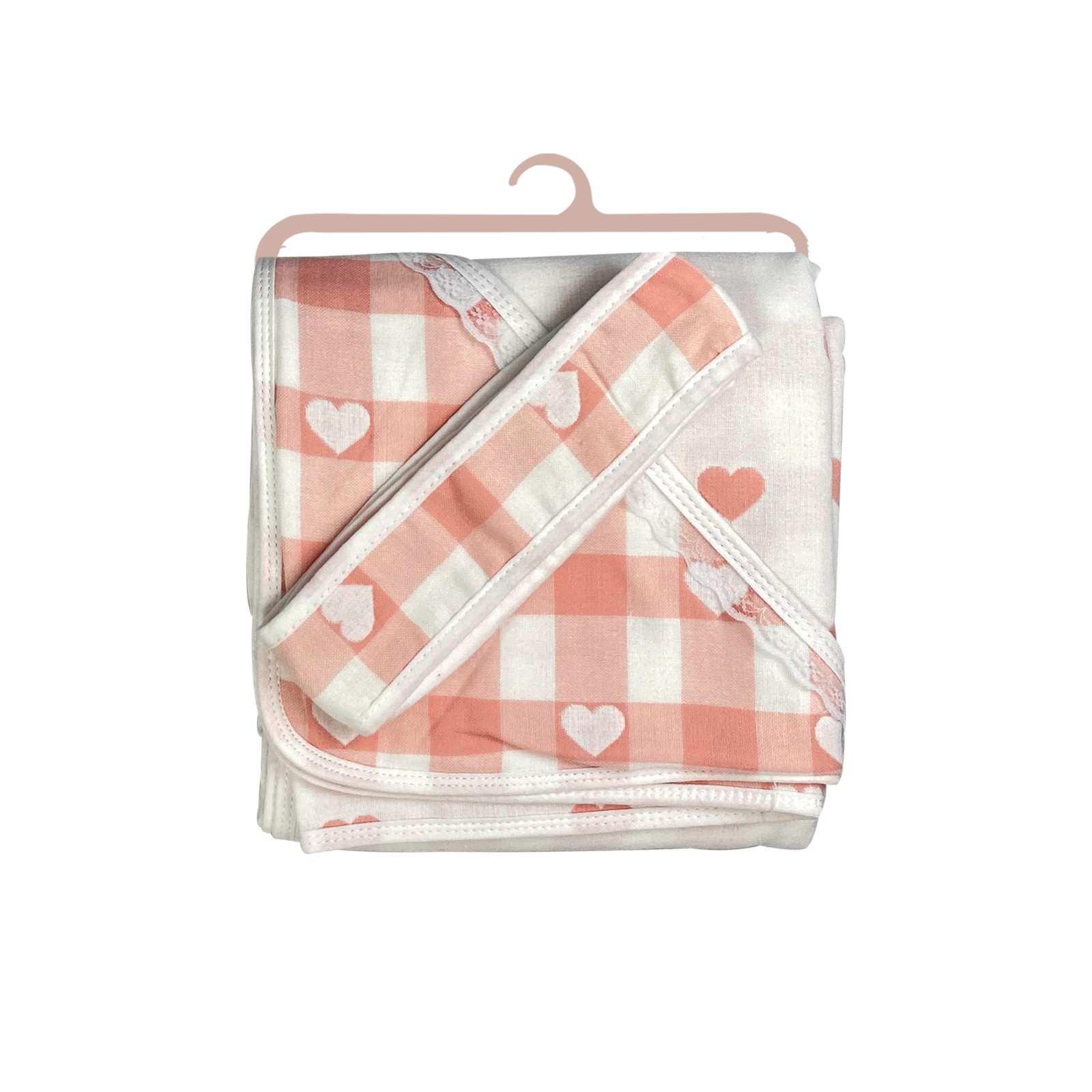 Pink Checkered Baby Hooded Wrapper with Heart Patterns